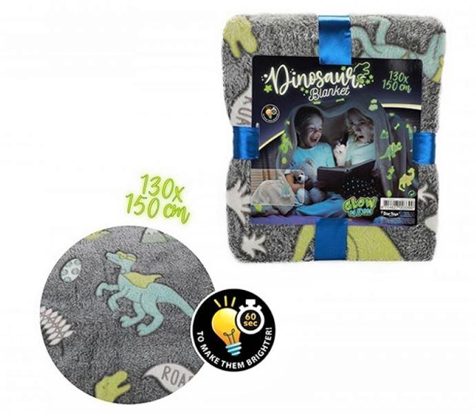 Svítící flísová deka s motivem Dinosaur.Materiál: 100% polyester, flís. Rozměry: 130 x 150 cm.